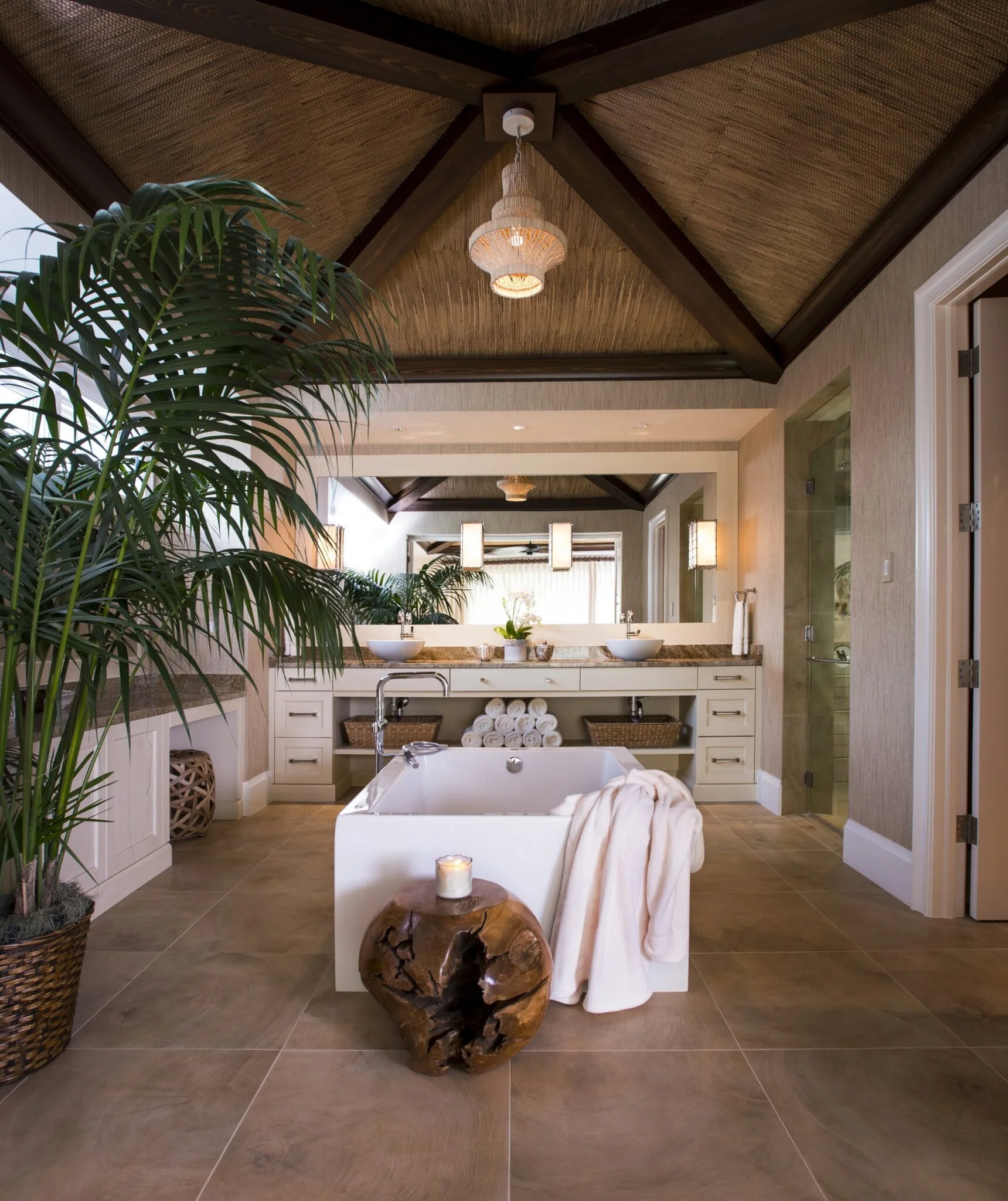 I try to envision the moments that might be had in the bathrooms. I always include a place for candles, for beverages, and crystals. I love to incorporate live plants into bathrooms when I can, and big jars of bath salts, and baskets of sponges. Abundance in all things. Sanctuary in all spaces, but especially the bath.